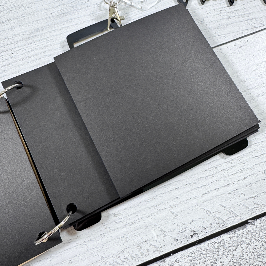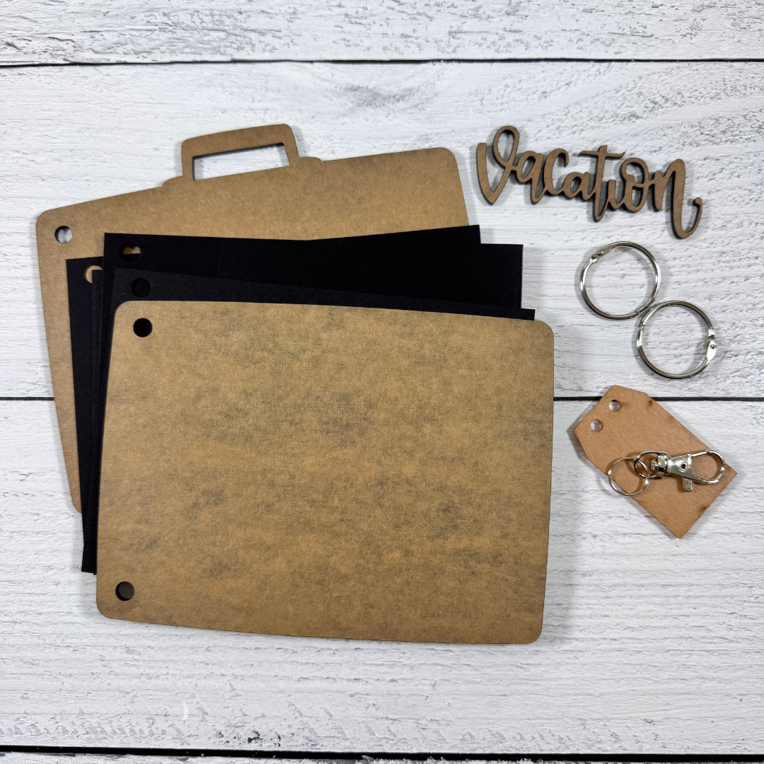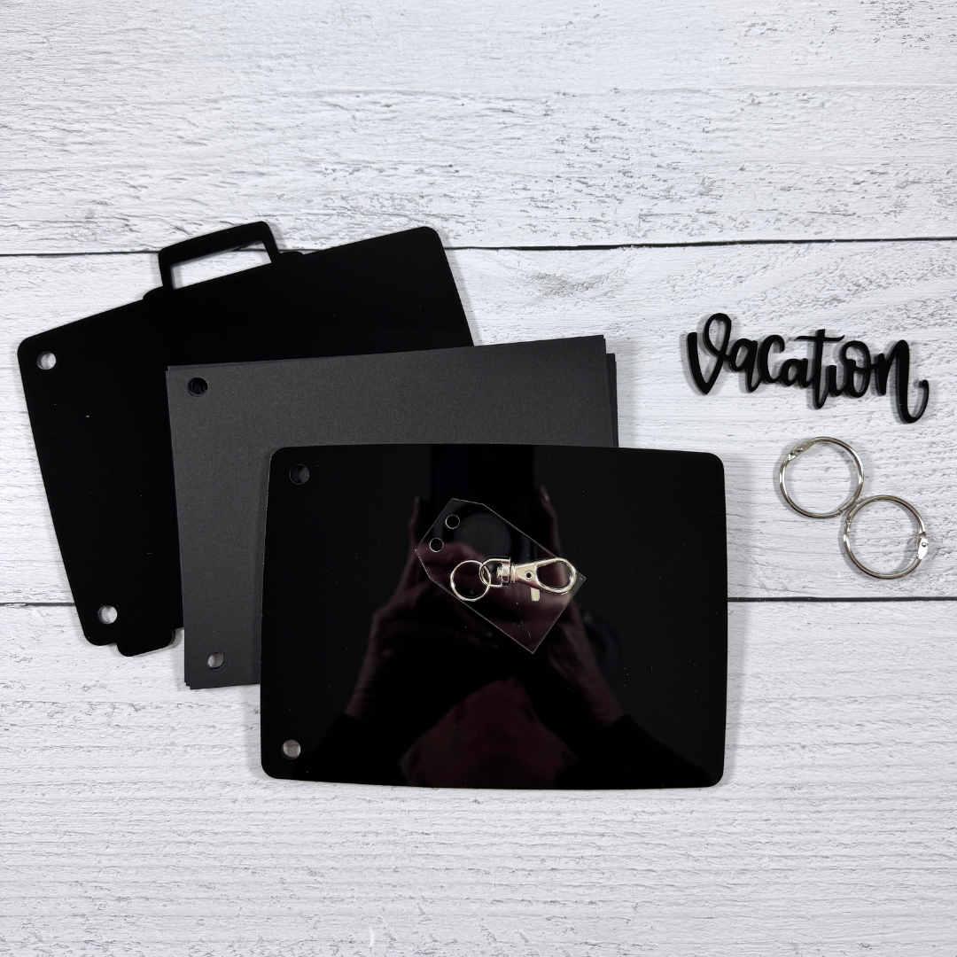 It has two 6.5 x 4.75 inch covers that are made of high quality 1/8" thick black acrylic. It comes with a vacation title, an acrylic luggage tag, a metal charm holder, 2 binding rings, and 12 scrapbook pages (6 double-sided) that include 2 fold-outs and 1 pocket page.