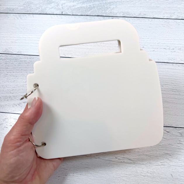The album is made of high quality 1/8" white acrylic and includes 2 tote shaped covers, 2 binding rings, and 8 white card stock pages that include 2 pockets and 2 fold-out pages.