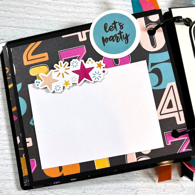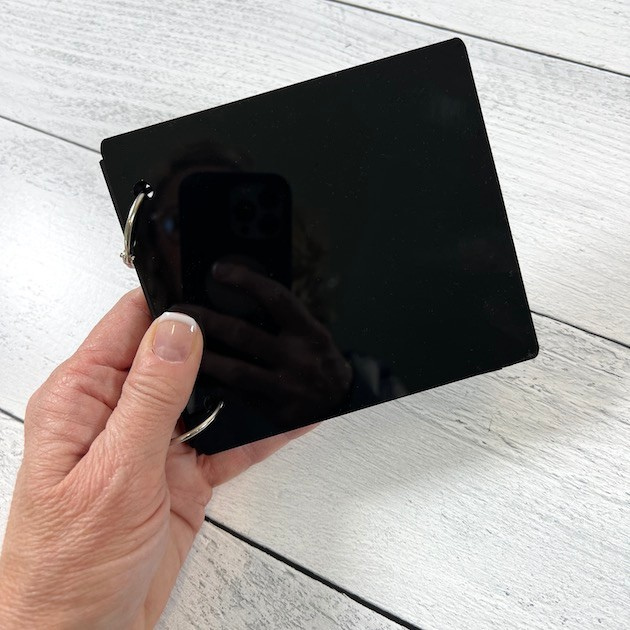 This was made with a custom Artsy Albums black acrylic album that's 5" x 4.5". It has 26 pages (13 double-sided) that include 2 acetate pages, 2 fold-out pages, 2 pockets, and space for 25 photos.